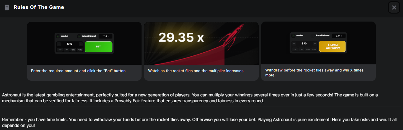 Throughout my experience with Astronaut Crash Game, I’ve come to appreciate the critical importance of responsible gaming practices. The game’s fast-paced nature and the thrill of watching multipliers climb can create an intensely engaging experience that, without proper boundaries, could potentially lead to problematic behavior.
